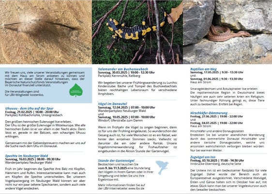 Vom traditionellen Vortrag zum Jahresvogel über Streifzüge in den Donauleiten zu Schlingnatter und Hirschkäfer bis hin zur Vogelstimmenwanderung ist zu jeder Jahreszeit und für jeden Geschmack etwas dabei.